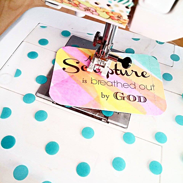 You’ll need to trim down the 12″ x 12″ sheet to fit your bible. I measured my bible page and then took off about a half inch on each side. Then I decided where I wanted my printed text to lay and stitched it down. I chose to just stitch back and forth in random lines but you could use whatever fancy stitch your machine offers or simply circle the text a couple times.