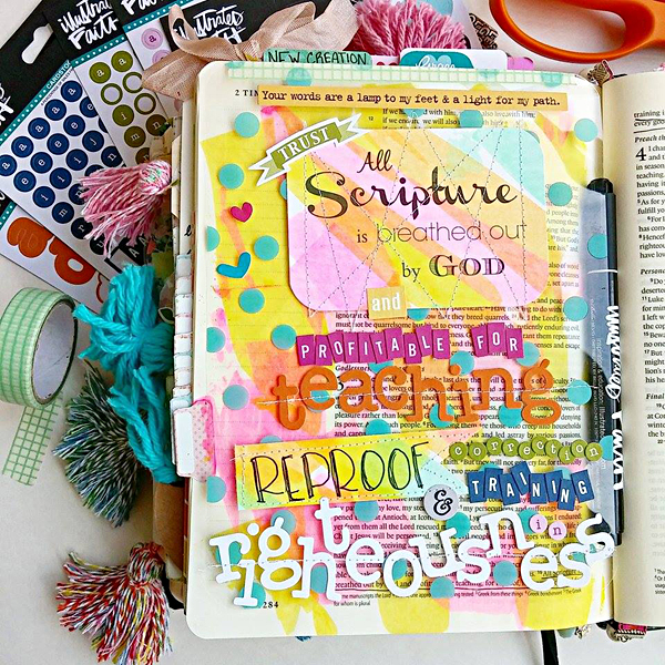 My favorite part, the finishing touches!! I chose a few other stickers from the IF Genesis kit to add a bit more emphasis of what this verse means to me. I also stitched across some of the alpha stickers to give a bit more texture. Once you’ve finished, attach it to your bible page with a piece of washi.