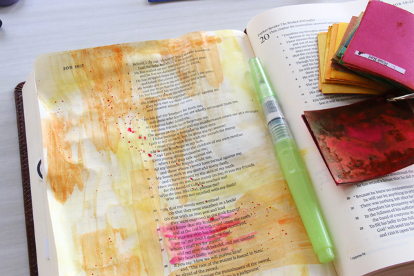 When I’m doing my Bible Journaling at home I create a giant mess! I typically take over the entire kitchen table as I spread out possible supplies before me. I reach for my stash of stamps, numerous old scrapbook kits, my entire paint and ink collection, a tub of pens…. well you get the idea!