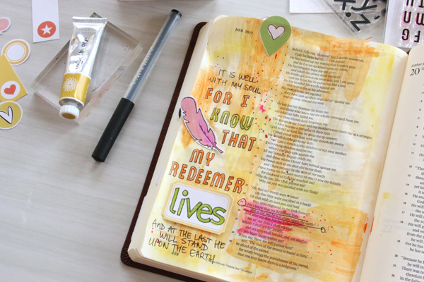 I Bible Journal in different ways at different times, but one of the ‘techniques’ I keep coming back to is to simply copy out the verse word for word in the margin. That way as I flick through my Bible, all my favourite verses are highlighted and easily readable. My verse today is from Job 19:25 which reads “For I know that my Redeemer lives, and at the last He will stand upon the earth.” At the very least I know that I want to get down the phrase ‘my Redeemer lives’ so I start off with that, stamping the words with Color Theory Ink. Next I added a feather from the stash of die cuts – admittedly not because it has anything to do with the verse, but mainly because it’s pink and I wanted to balance out the pink paint! I think it’s sometimes ok to add decoration just for decoration sake without it having any hidden meaning!