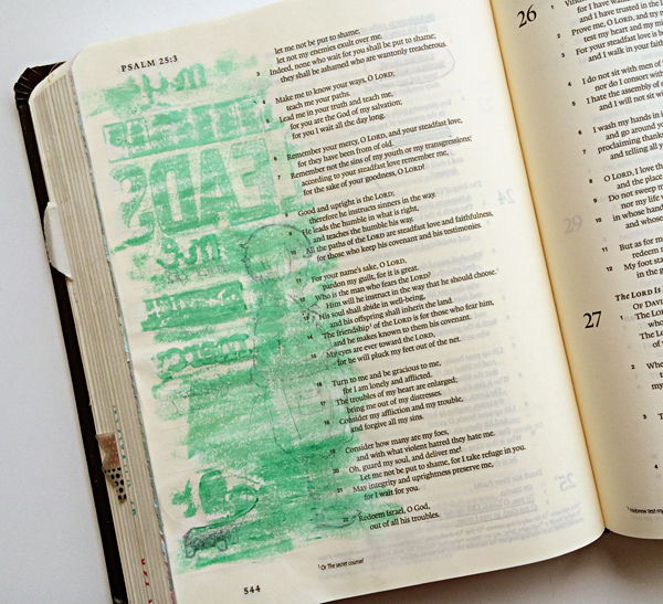 This week, as I was doing my daily reading in Psalms, the verses in Psalm 25 leaped out at me where David is asking God to teach him His ways and instruct him in the way He should go. I wanted to illustrate these verses in the margin, so I started by coloring in the margin with a Gelato crayon. There was a big problem with that though! It was really cool as a “rubbing” but NOT the effect I was going for!