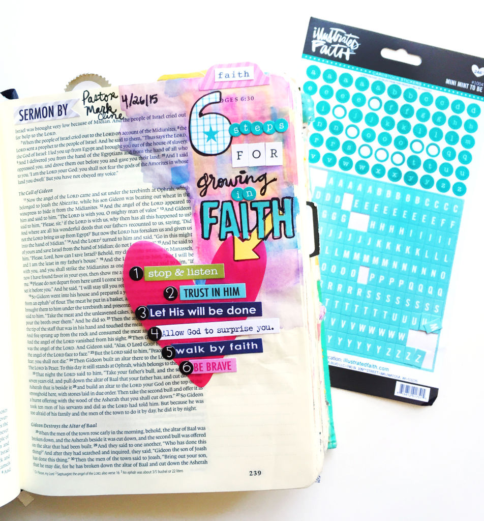 I’ve recently had several people ask me the question, “What do you start with for illustrating in your Bible, the verses or the idea?” That’s kind of like the old question, “What came first, the chicken or the egg?” The answer for me is that it depends! It depends on whether I’m reading and studying through a book of the Bible or responding to a message at church or using a devotional reading like Jesus Calling or the ones that Illustrated Faith has provided over the last few months. Those things often lead to verses that I want to highlight in my Bible. Sometimes it’s a product like a die cut or sticker or a stamp that makes me think of a verse in the Bible that I can illustrate with that product.