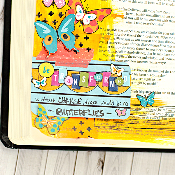Then I took some paint daubers and colored the edge of the page. I took one of the journal cards and added alpha stickers to say “be transformed”. I took a dot runner across the backs of the butterflies and adhered them to the background.