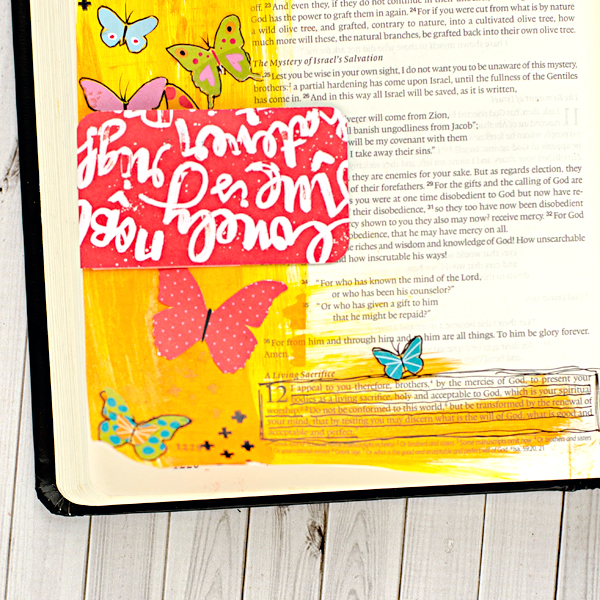 I didn’t want to cover up the scripture with my little card, so I adhered the card with washi tape, just at the top. I tucked the bottom behind one of the butterfly wings so that I can flip it up if needed and tuck it back in.
