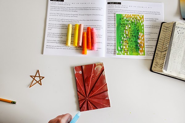 I wanted to take you step by step through the process of making an entry in my journaling bible. This entry is from Illustrated Advent day 17. I remember reading through the devotional and this “shine” illustration coming to mind and I immediately thought of the sunburst stamp. I knew I wanted to create a graduated color effect and thought it would be fun to use the gelato. My favorite ways to use the gelato with the stamp is with a mister to create this fun watercolor effect with the gelatos. If you have’t tried it yet, YOU MUST!!!