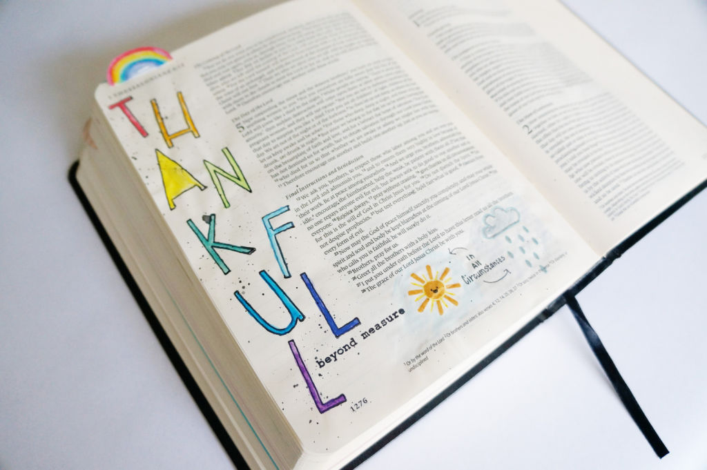 Hi Crafty Friends! When Shanna asked me to share my journaling bible with you all I was honored (and a little nervous because I just started). I grew up thinking that you weren’t supposed to write in your bible. Not that anyone told me that, I just assumed because I never saw anyone do it before. To be completely honest I have very rarely picked up my bible in a long time. Now, I find myself wanting to dive into my bible several times throughout the day and the word really stays with me more than it did before. Using my creativity and my love for Jesus has really made this something very special to me. Today I am sharing pages on being Thankful. Being thankful when everything is going just right is easy (for me) but it was the being thankful with times were really very hard that I had to learn. My husband was out of a job for almost a year; our marriage was rocky not to mention the 5 kids that we were raising were hard at times. We started going to church and I started thanking the lord for EVERYTHING even the hardship we were finding ourselves in, because though that I knew that he had a plan (and he definitely did). By having a thankful heart though the rough times we stop focusing on ourselves and focusing on the only one who is really in control and TRUSTING in him. My prayer for all of you today is that you have a heart full of thanksgiving not just this month but 365 days a year. In addition to a few pictures that I will post here, I thought I would share a little video talking about a couple of my pages and what I used. Colossians 3:17 For this page I used some die cuts out of watercolor paper, colored with distress ink and water accented with some gold paint. The sequins are some from the autumn mix in my etsy shop and just glued on with a little bit of glossy accents. I added a transparency page for the final touch. I printed the verse on the portion covering the text and the “Be Thankful” over the journaling column. In the video I show how to attach the transparency in the bible. There is also a thin strip of gold washi tape covering the glue in the center; you could easily skip this step because the glue really isn’t noticeable.
