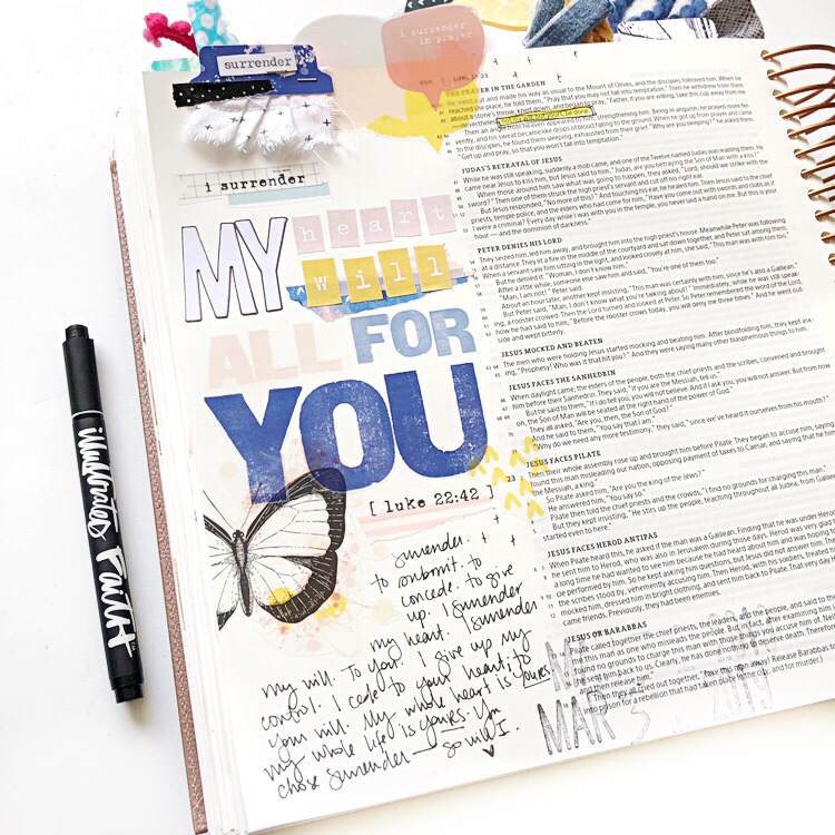 Bible Journaling has changed my life in more ways than I can count–and not just by taking over a corner of my house for crafty supplies! I started Bible Journaling almost 4 years ago after stumbling upon Shanna’s blog and Illustrated Faith etsy shop. Suddenly, the Bible wasn’t just text on a page–it was words that were alive and bright and colorful! God has met me on the pages of my journaling Bibles in ways I never imagined. I have seen Him vividly and heard Him clearly. Bible Journaling has made the Bible alive and applicable and real to me in a way it hadn’t been in a really long time. I never really considered myself an “artist,” and even today, there are definitely moments I feel like I have no clue what I’m doing. But this journey has lit up passions and creativity in me that I didn’t know had been lying dormant and longing to be shaken free. Not only that, but Bible Journaling has brought me so many amazing friendships and a fantastic online community. I have been so blessed and changed by Bible Journaling and will forever be thankful.