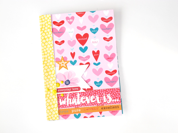 I printed out a bunch of Bible chapters on my regular printer. It’s a standard translation (NKJV) and I just copied whole chapters of stories I think she would enjoy. I shrunk it down so each A4 piece of paper would have two pages on it and then I cut these in half. She’s young – she can read the small print, and this way the size of the journaling Bible remains manageable. I made sure to keep plenty of blank pages in there too so she would have somewhere to illustrate her faith. I bound them all together and made a cover out of patterned paper from the Bella Blvd Whatever is Lovely collection. I was a bit sneaky here because I struck up a conversation to determine which was her favourite paper and when I found out it was the one with all the hearts I made sure it became the cover! I decorated it with tags and stickers and a few enamel dots. So far I’ve got 64 pages in this Bible which is far from being a complete Bible but should give her a good starting point, and by making the spine relatively thick I think I should be able to add more pages to it as the need arises. Or I might just make a new one and call it a series!