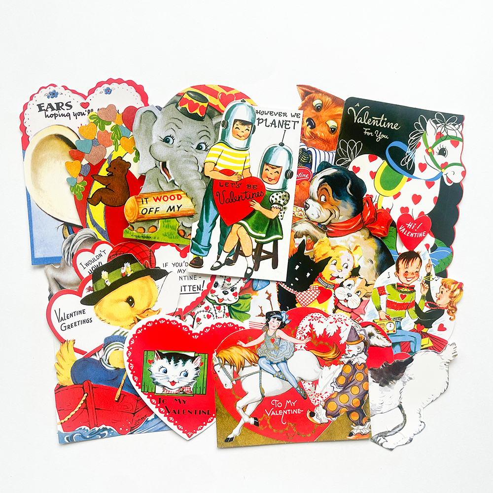 Die-cut retro valentines! 15 unique die-cut reproductions of vintage valentines featuring adorable animals and sweet children, plus printed envelopes, our {Cool for School} card packet brings the whimsy on Valentine’s Day.