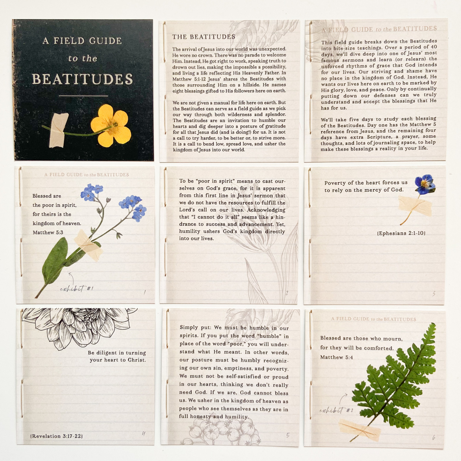We are not given a manual for life here on earth. But the Beatitudes can serve as a field guide as we pick our way through both wilderness and splendor. The Beatitudes are an invitation to humble our hearts and dig deeper into a posture of gratitude for all that Jesus did (and is doing!) for us. It is not a call to try harder, to be better, or to strive more. It is a call to bend low, spread love, and usher the kingdom of Jesus into our world. This deep-dive study, on Matthew 5:1-12, is spread out over a 40 day period, and makes a wonderful place to park your heart, mind, and soul during the season of Lent.
