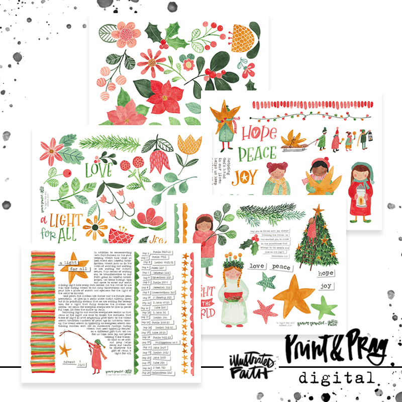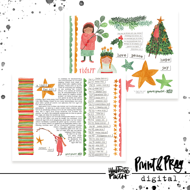 These pages feature lovely watercolor illustrations inspired by various Advent traditions throughout the world, as well as patterns, and a basic daily devotional that coordinates with “A Light for All.” The same palette and a more detailed daily reading plan with prompts are found in both the “A Light for All” digital and physical traveler’s notebook kit.