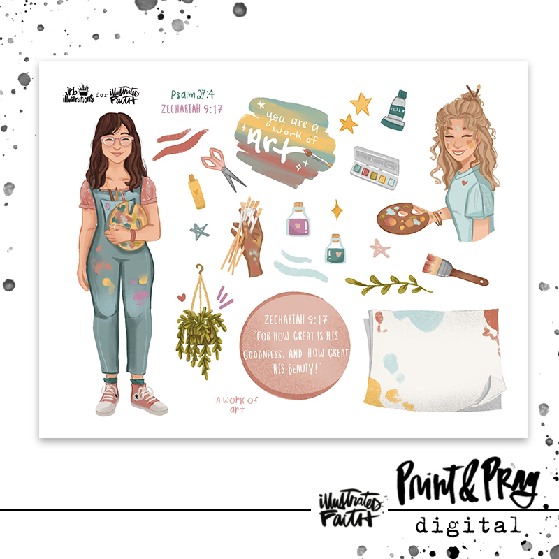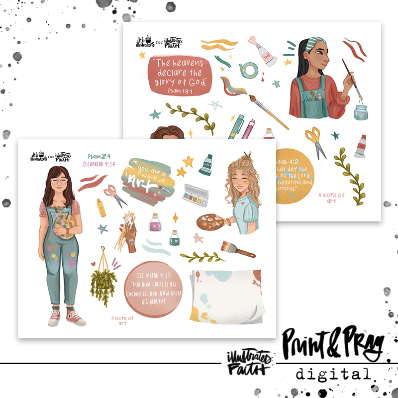 This Illustrated Faith guest artist, Josée B. has created this gorgeous set that hits close to home for all the artists in this community. The girls in A Work of Art are so real, not to mention covered in paint, that they remind us of ourselves. :) They really shine a light for how flawed & beautiful His children are & how great is His glory!