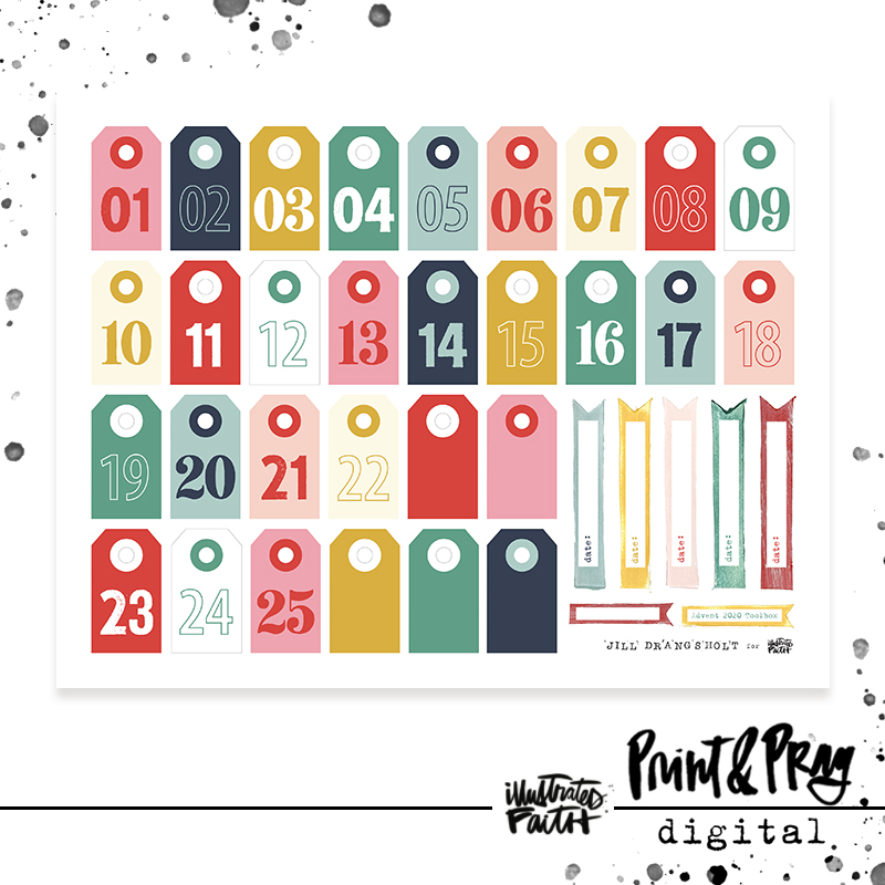 Jill believes that you can never have too many styles of numbers to use during daily projects like Advent, so she created two pages of cute numbers to use with the 2020 Advent products or any other December craft project you are working on. The set includes a page full of mini tag numbers, a page of hand stamped numbered stars, and even a few hand stamped date banners.