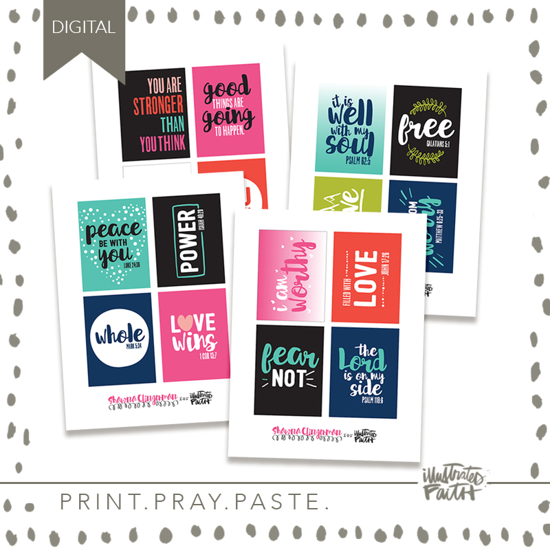 Print out these incredibly encouraging affirmation cards designed by Shawna Clingerman as a fun tool to illustrate your faith! These cards are perfect for tip-ins, pocket pages, or Project Life scrapping! You can even tuck one into a greeting card for a friend that needs a little boost! :)