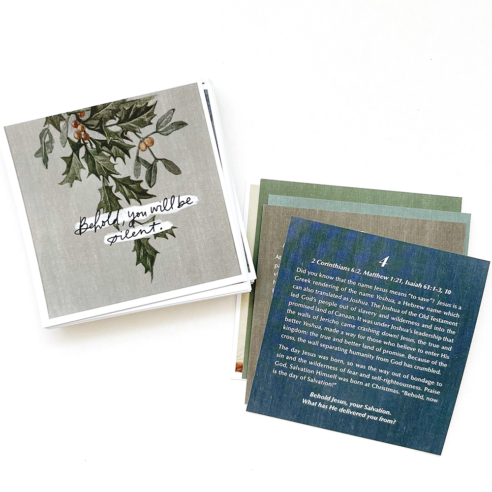To “Behold” means to stop, turn, and pay careful attention to something. The “Behold the King” Advent card set highlights 25+ “beholds” from the story of Christ’s birth and life, inviting you to slow down and draw near to Jesus this December. Each card includes beautiful vintage artwork, as well as a scripture reading plan and original devotionals by Taylor Rauschkolb. These daily cards also feature prompts and questions to help you truly “Behold” the One who came at Christmas! Enjoy the updated and expanded Behold the King set– the Scripture readings are mostly the same, but the devotions are all new!