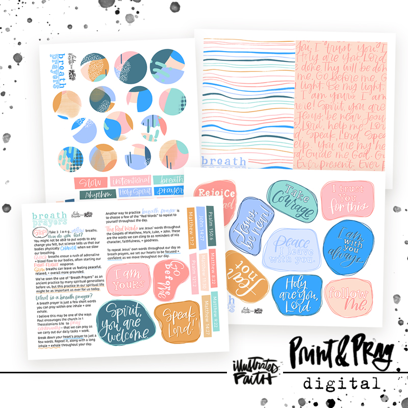 This set by Emily Karwoski is just an introduction to learning the practice of breath prayers. Use the pieces in this set to journal in your Bible, place reminders on your desk, your mirrors, or your kitchen window.