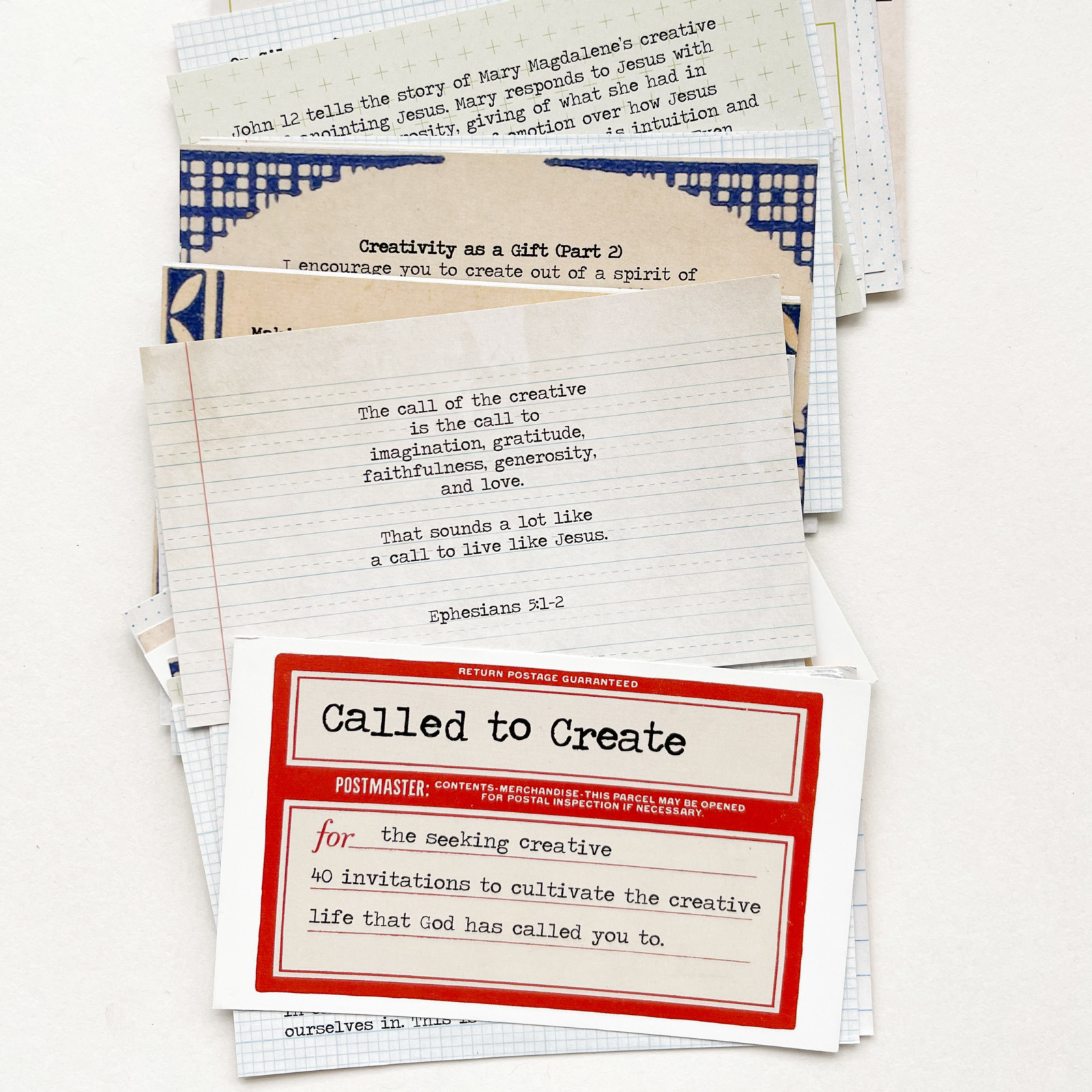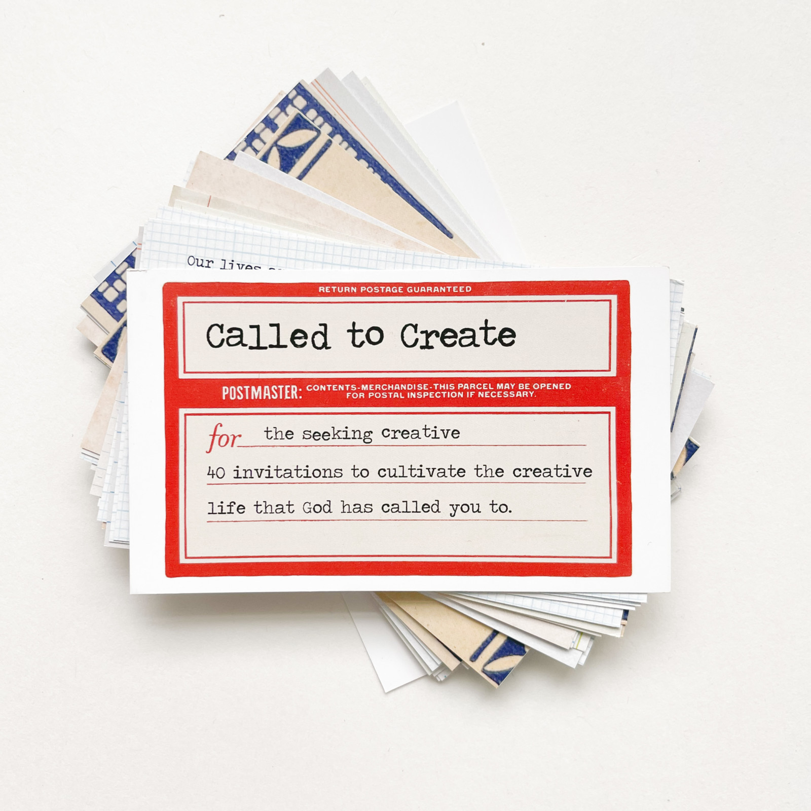 Do you hear it? The imprint on your soul, the stamp on your heart, that little part of you, calling you to create. Don’t ignore it, even if it’s different than the calling of others around you. You’re receiving an invitation, from the King of the universe, no less. He’s asking you to share yourself, your life, what you’ve learned and what you’re going through now. But maybe, like me, you don’t feel the calling to share from a stage or from a best-selling book, or even in online avenues. And you know what? That’s not by accident! God didn’t make a mistake when He made you the way you are. He’s calling you to create, to make visual your journey here on earth. He’s calling you to make beauty, using your hands, your heart and a huge variety of art supplies. He’s calling you, to show, to make visible, intangible things, like the kingdom of heaven, the love of Jesus, abundance and gratitude, lightness and hope, and above all, love.Here are 40 invitations to cultivate the creative life that God has called you to. Forty double-sided cards, with musings at the intersection of faith and art, thoughts and scripture about being a creative, and encouragement to keep creating. Each card has text on one side, and the reverse is a vintage paper or scrap, or a partial piece of art. These are meant to inspire, to engage with, to create something as you ponder the words. God has something to say to you, and through you, that is why He has called you to create.
