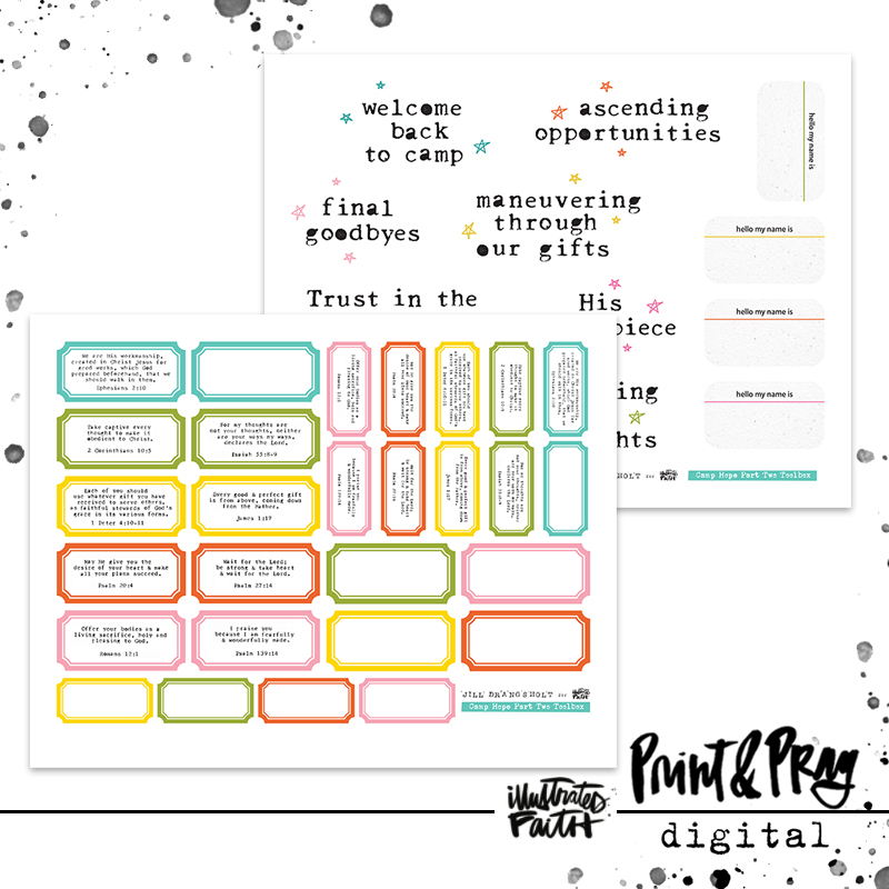 This toolbox was designed to use alongside the Camp Hope Session Two devotional kit. It includes scripture labels from the kit typed out for you on Jill’s vintage 1957 Royal typewriter, a few blank labels, bonus scripture labels in a mini size, and title starters directly from the devotional. If you’d like your typed scriptures on something other than a label, you can always print the labels on translucent paper (like clear sticker paper, acetate, or vellum) and then cut the scripture out of the center to adhere to anything you want to. Or cut them into strips for scripture wordfetti!