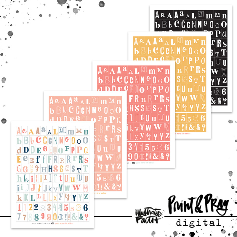 Jill has given us a digital version of the tile alphas she designed for the Good News kit so you never have to worry about running out! Plus, some solid background versions to give you plenty of options for mixing and matching.