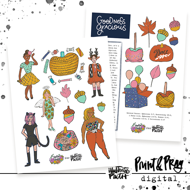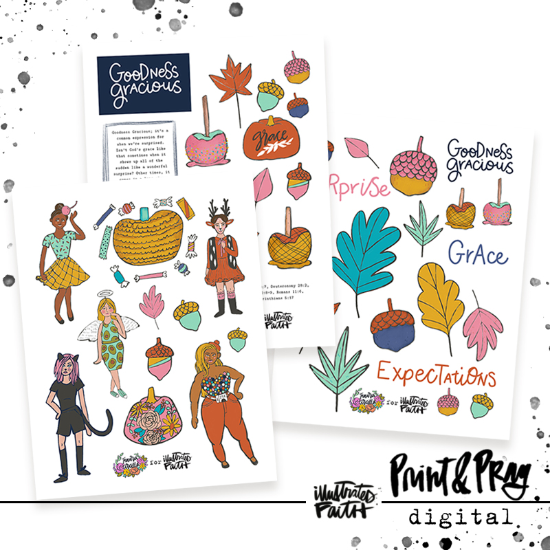 “Grace is when human expectation is overwhelmed by God sized gifts! I wanted to capture that sense of surprise and package it in a deliciously autumnal experience. I hope this set feels like crisp fall air; leaves crunching underfoot; and they joyful mystery of friends in costumes and their sweet exchanges. Goodness Gracious, His GOODNESS is so GRACIOUS! ” -Tamara Arcilla