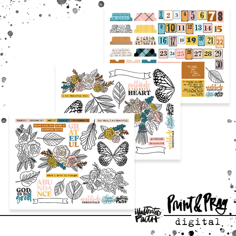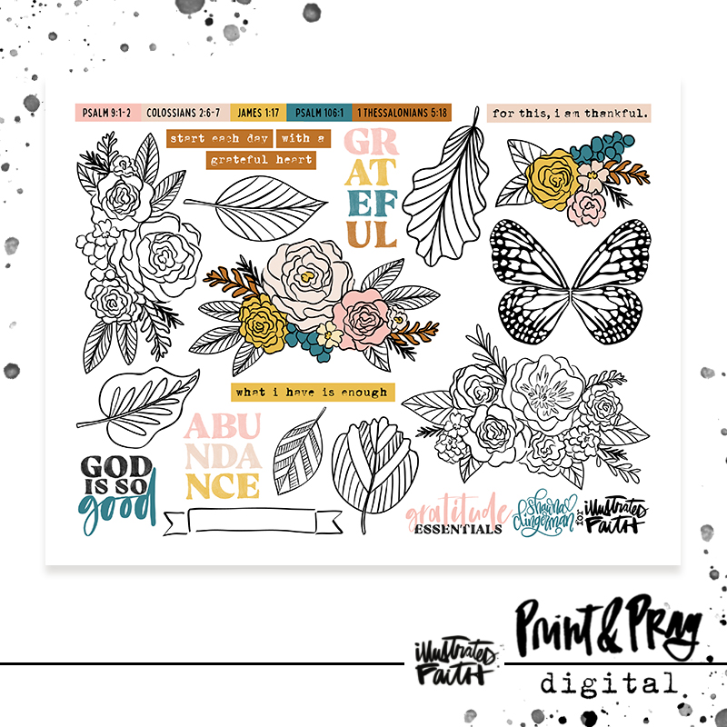 As we are entering a season of gratitude and our own individual Gratitude Documented projects, Shawna has put together pages filled with lots of usable, versatile illustrations and elements! Use these bits to support your own gratitude projects this year!!