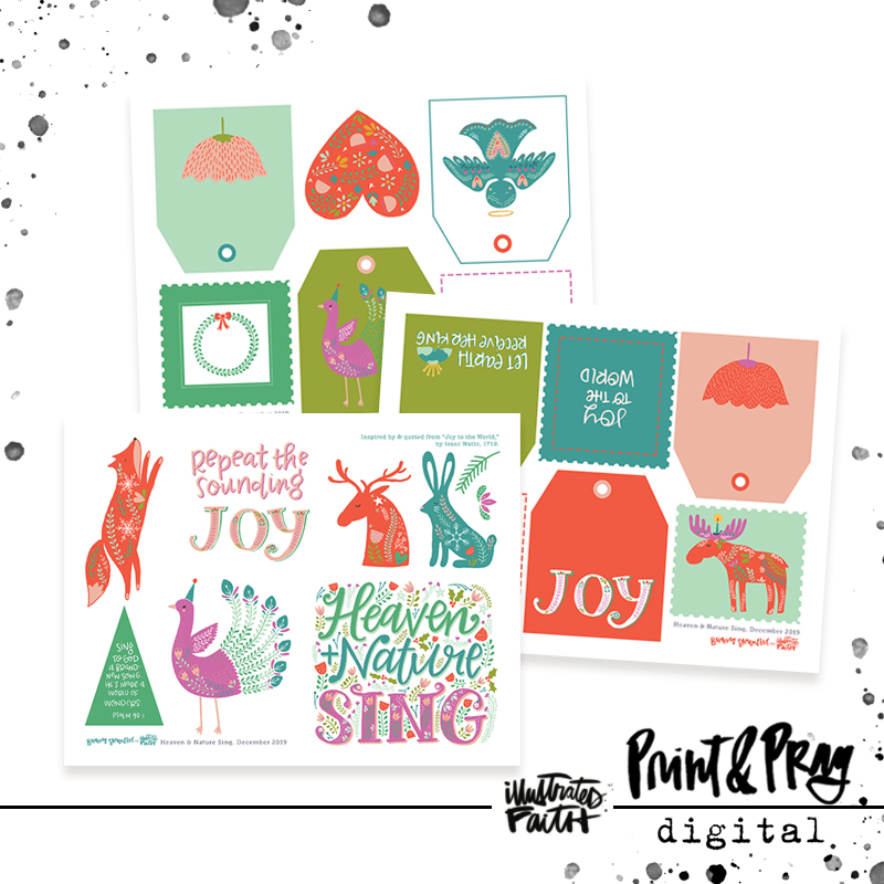 “With the theme of “Joy to the World” being the glory and wonder of the Kingdom of God right here on earth, it’s no secret it’s one of my very favorite Christmas hymns. For this month’s set ‘Heaven & Nature Sing,’ I did a series of angels (for the heaven part), and animals (for the nature part). The natural world is so inspiring to me, and I wanted to capture the simplicity yet also the complexity of God’s creation. So I juxtaposed simple outlines with ornate decorations. I’ve hand-lettered a few phrases from the song that will make wonderful cards or tiny prints, as well as some fun tags to use while journaling or even for gift-giving. May your Christmas season be filled with the joy and wonder of the greatest gift ever given.” -Brianna Showalter