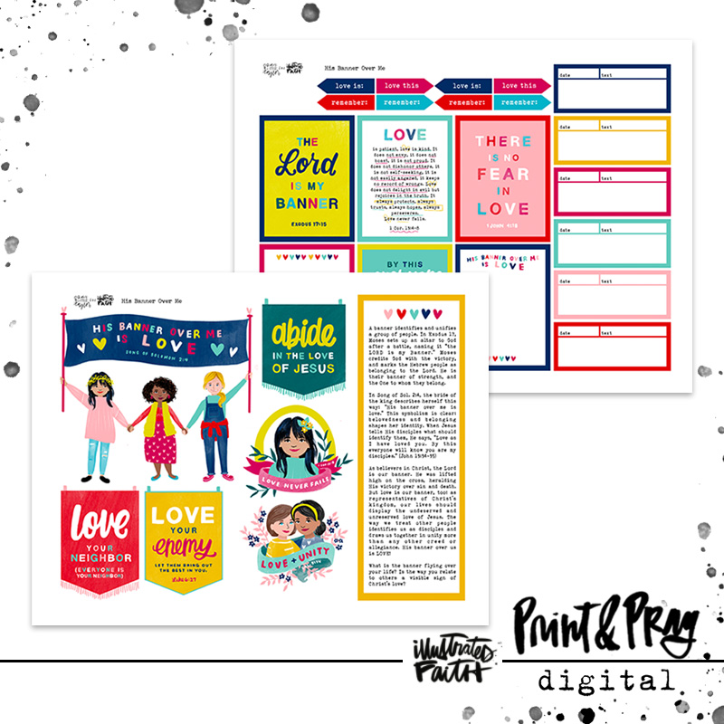 A banner is a visible symbol of identity. As disciples of Jesus, our banner is His love! It’s what sets us apart and marks us as His. “His Banner over Me” is a devotional set from Taylor Rauschkolb featuring darling girls, brightly colored banners, and lots of scriptures about love to look up and study! Be sure to check out the coordinating patterned papers!