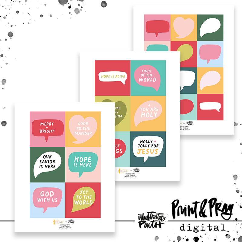 Kristina created this merry + bright talk bubbles set for all of the hopeful hearts out there. In this three-page set, you’ll find two pages of 3 x 3 talk bubbles with words of praise and encouragement and another page of 2.5 x 2.5 talk bubbles just ready for you to add your own sentiments with your handwriting, a typewriter, stamps, stickers or whatever you’d like. Use these merry + bright bubbles to remind you to keep your eyes on God and to easily share some encouragement with someone needing a bit more hope in their heart. These talk bubbles are a fun way to add a pop of color and hope to your Bible journaling projects of any kind and are perfect to use with the Come & Carol Advent devotional kit.