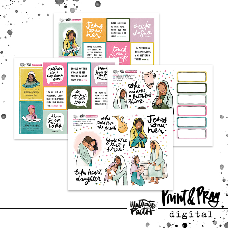Luke 13:12 says, “When Jesus saw her, He called her over and said, “Woman, you are set free.” Many of the women Jesus interacted with in the gospels go unnamed, but they are never, ever unseen. The Bible includes so many examples of Jesus not only honoring women, but really seeing them. Jesus consistently reached out to heal, free, teach, and empower women for ministry! This set, called “Jesus Saw Her,” is inspired by the way Jesus honored the women He encountered: figures like Mary Magdalene, Mary and Martha, and the woman at the well, as well as many more! It includes tons of scripture and journaling cards, as well as some biblically-inspired illustrations! Be sure to check out the matching patterned papers.