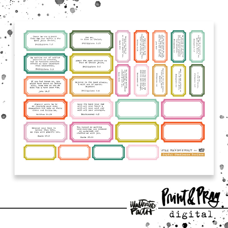 This toolbox was designed to use alongside the Joyful Obedience devotional kit. It includes scripture labels from the kit typed out for you on Jill’s vintage 1957 Royal typewriter, a few blank labels, and bonus scripture labels in a mini size. If you’d like your typed scriptures on something other than a label, you can always print the labels on translucent paper (like clear sticker paper, acetate, or vellum) and then cut the scripture out of the center to adhere to anything you want to. Or cut them into strips for scripture wordfetti!
