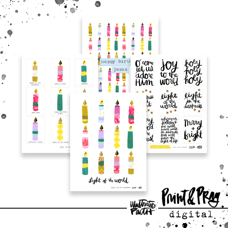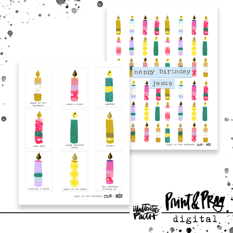 Cut + paste Mary’s “Light in the Darkness” elements + incorporate them into your projects this season! Printing them on clear sticker paper adds a fun element to your art and bible journal pages! Use them as gift tags, or sprinkle them around your home as a reminder of Jesus. Glory to God in the highest!