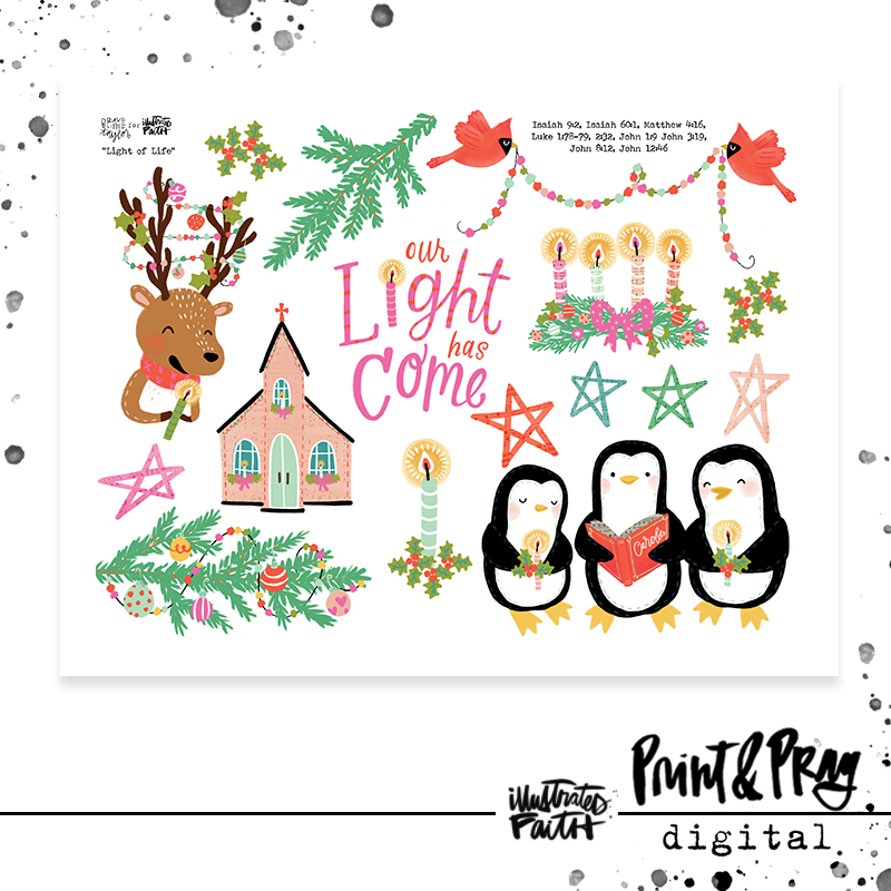 “‘Light of Life’ was inspired by a Candlelight Christmas Eve service. Singing ‘Silent Night’ to the glow of candles always reminds me that Jesus is the True Light. He empowers us to shine brightly with His love! Caroling critters, candles, and festive greenery fill out this set, along with plenty of scriptures to help you worship King Jesus, the Light of Life. Be sure to check out the coordinating patterned papers.” -Taylor Raushkolb