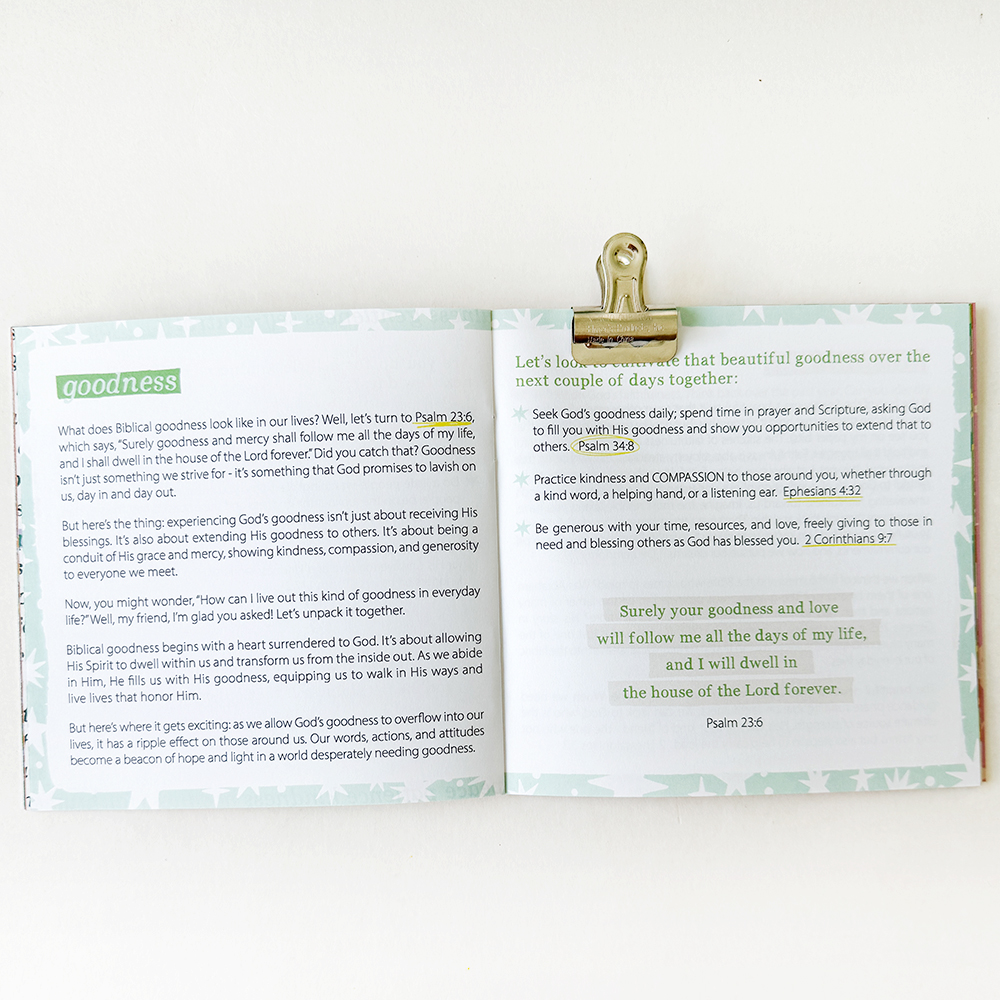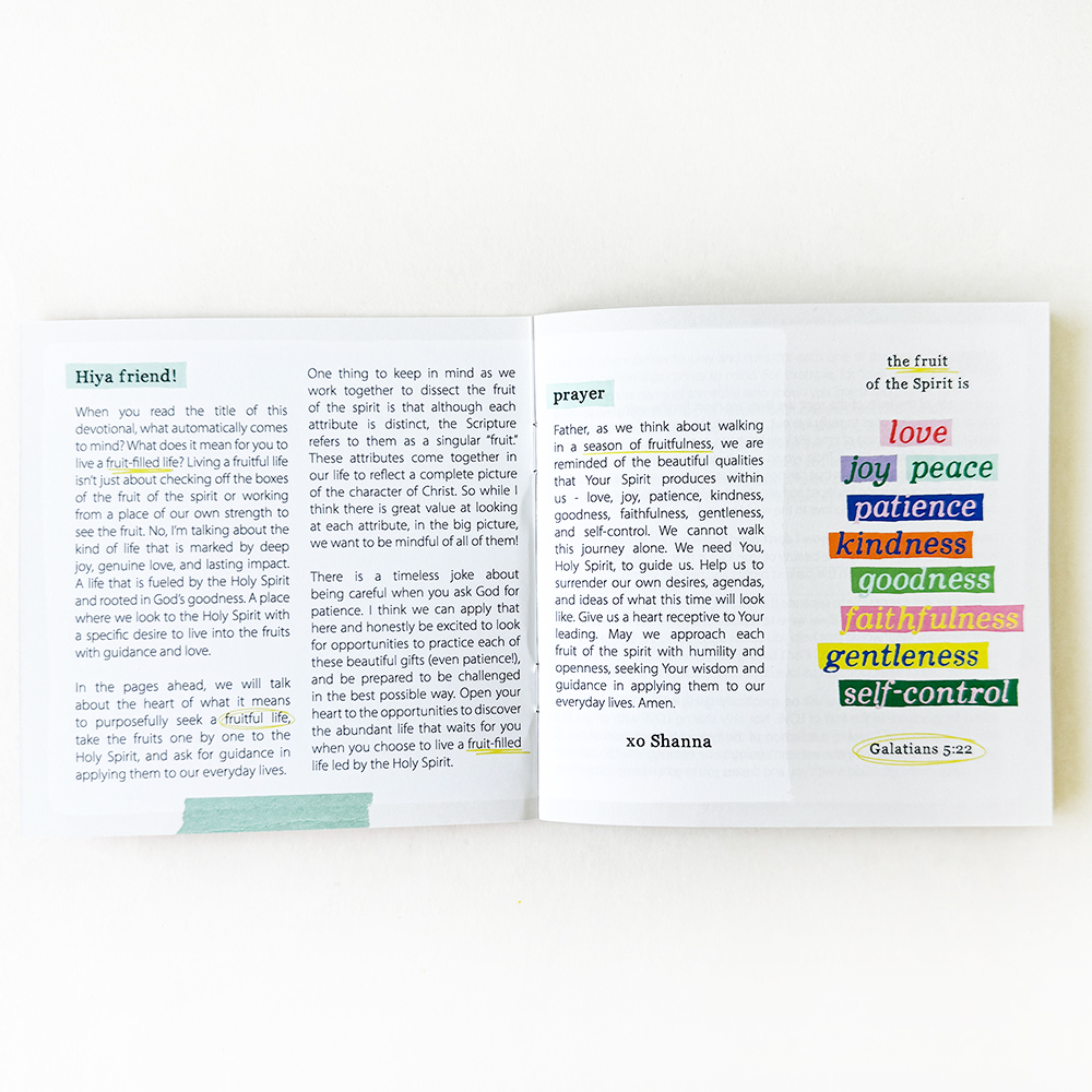 Hiya friend! When you read the title of this devotional, what automatically comes to mind? What does it mean for you to live a fruit-filled life? Living a fruitful life isn’t just about checking off the boxes of the fruit of the spirit or working from a place of our own strength to see the fruit. No, I’m talking about the kind of life that is marked by deep joy, genuine love, and lasting impact. A life that is fueled by the Holy Spirit and rooted in God’s goodness. A place where we look to the Holy Spirit with a specific desire to live into the fruits with guidance and love. In the pages ahead, we will talk about the heart of what it means to purposefully seek a fruitful life, take the fruits one by one to the Holy Spirit, and ask for guidance in applying them to our everyday lives. One thing to keep in mind as we work together to dissect the fruit of the spirit is that although each attribute is distinct, the Scripture refers to them as a singular “fruit.” These attributes come together in our life to reflect a complete picture of the character of Christ. So while I think there is great value at looking at each attribute, in the big picture, we want to be mindful of all of them! There is a timeless joke about being careful when you ask God for patience. I think we can apply that here and honestly be excited to look for opportunities to practice each of these beautiful gifts (even patience!), and be prepared to be challenged in the best possible way. Open your heart to the opportunities to discover the abundant life that waits for you when you choose to live a fruit-filled life led by the Holy Spirit.