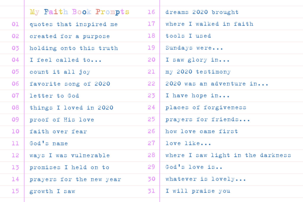 As we got ready to launch this book I realized how perfect it would be to document some of 2020 in the new year! I oftentimes find that documenting such an important topic is best done as close to the event as possible. So we are going to take the first 31 days of the year (in Jan) and work through some prompts on how we saw Jesus work on our lives and those around us in 2020! I know it was a hard year but wasn’t it amazing to see how God used that time? Of course, you can use your journal however you would like but if you would like to join us see the info below!