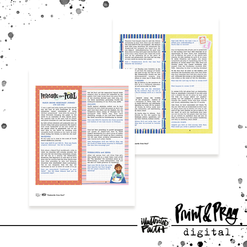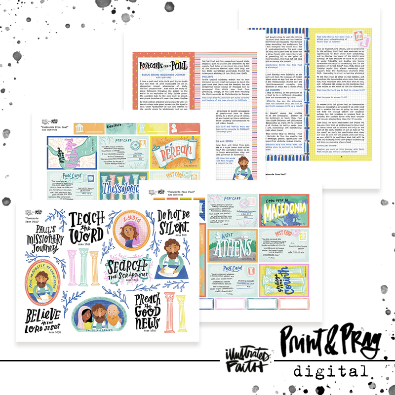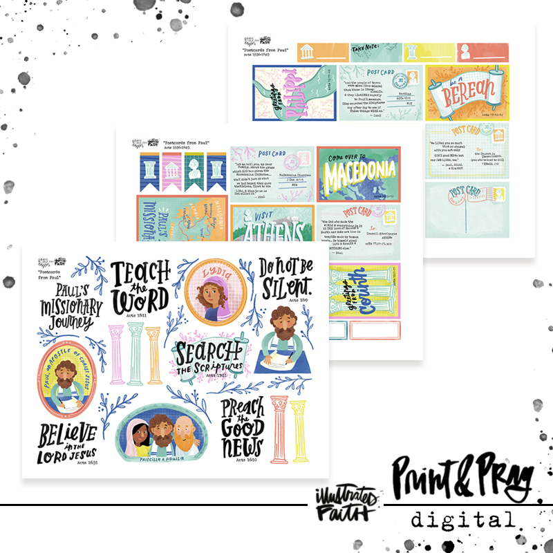 “Postcards from Paul” explores the second missionary journey of the Apostle Paul. This set takes a journey through the days of the early church in the book of Acts, complete with “postcards” from the cities like Corinth, Athens, and Philippi! Each postcard even includes scriptures the apostles Paul and Luke wrote about each city. Discover how the gospel spread and be inspired to speak boldly about Jesus, too! The set also includes title starters, outline florals, and some biblical characters to use as you journal through Acts 15-18. Coordinating patterned papers are included, too!“ -Taylor Rauschkolb