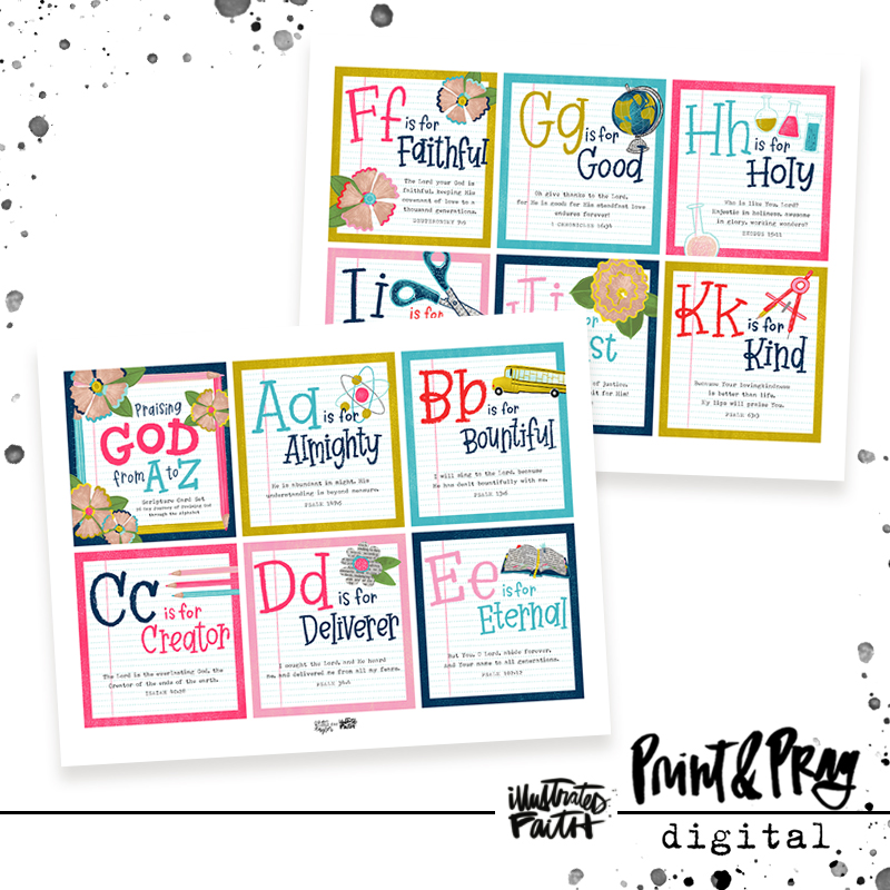 Praising God is as simple as as A-B-C! This printable set of 26 cards features one attribute of God’s character for every letter of the alphabet. Designed to prompt daily prayer & meditation, these scripture cards will inspire you to praise God for who He is & what He has done. Embellished with original art & lettering, this school supply themed set reminds us to never stop learning about the Lord!