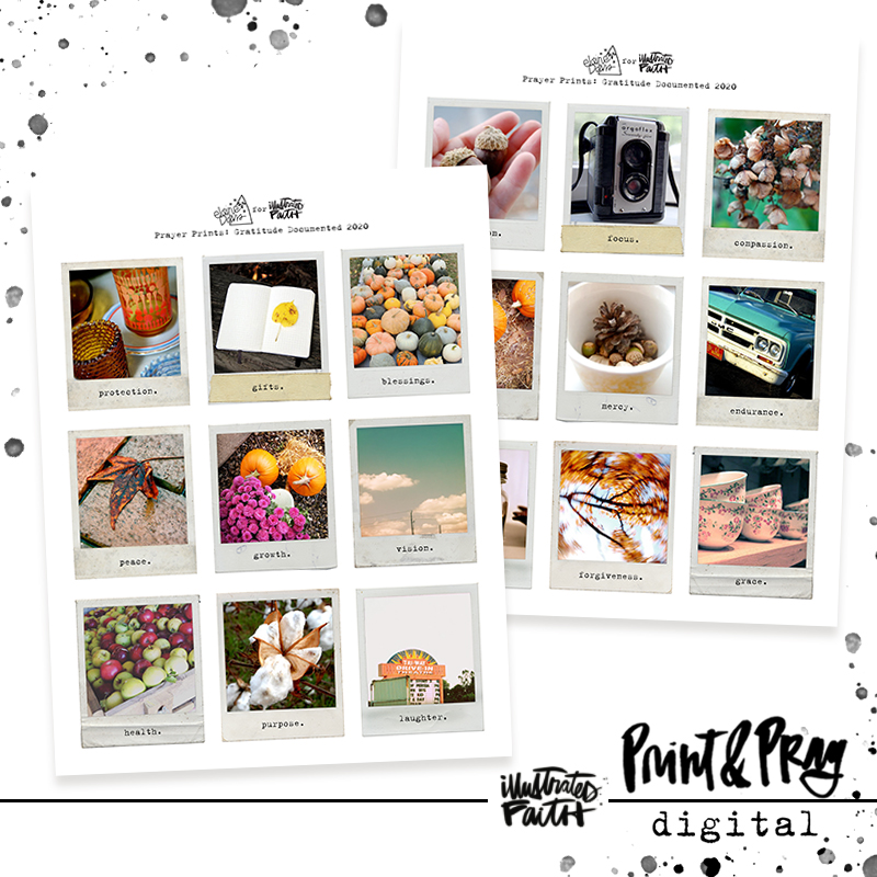 Elaine Davis has created this Prayer Prints series based on her love for photography & what our photos can tell us about our emotions. She’s used her own photos through the years to create these little instant photo style images for the margins of your Bible. With vintage typewriter captions, your entries will feel like a scrapbook of your prayers!