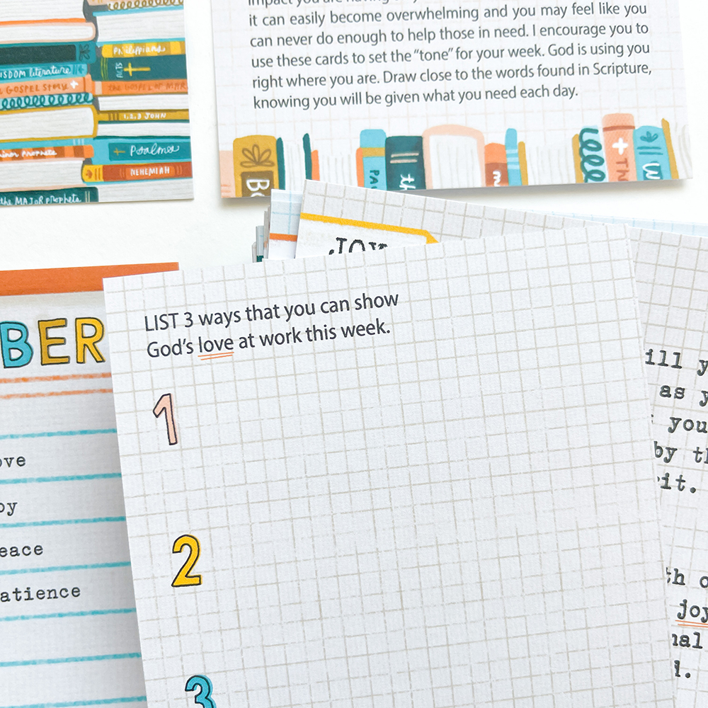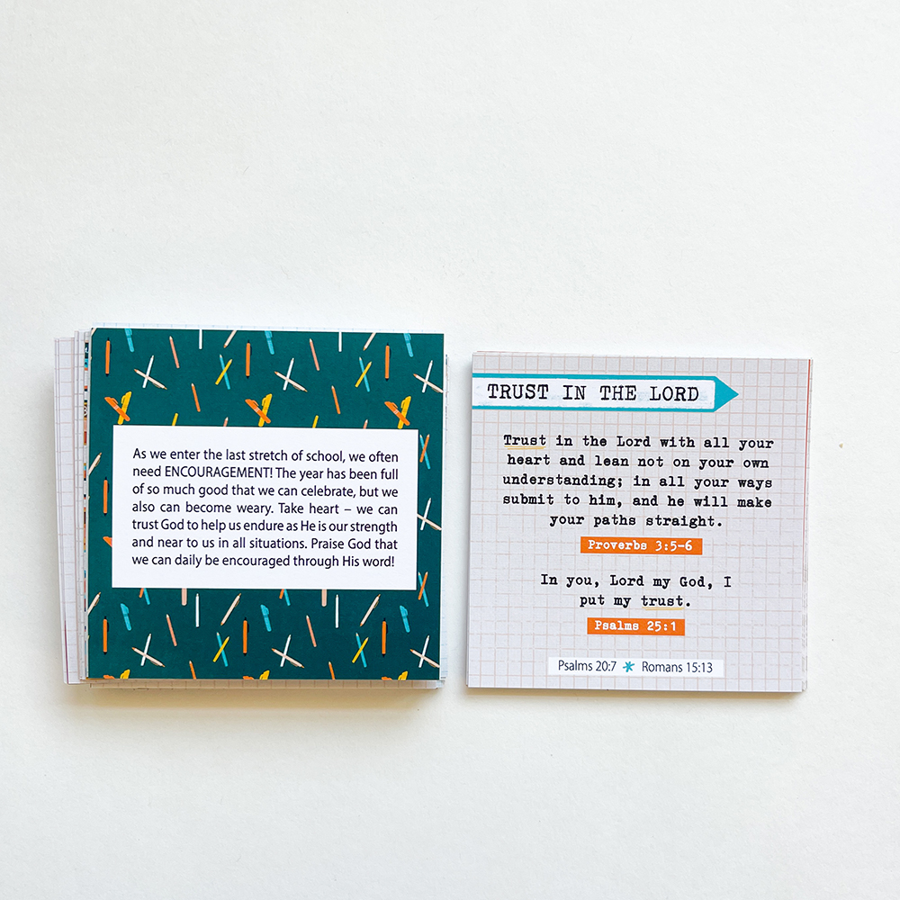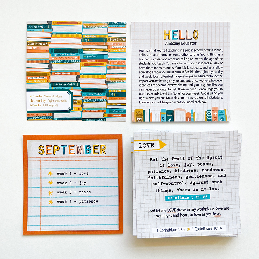 You may find yourself teaching in a public school, private school, online, in your home, or some other setting. Your gifting as a teacher is a great and amazing calling no matter the age of the students you teach. You may be with your students all day or have them for 50 minutes. Your job is not easy, and as a fellow educator, I know you must remain flexible throughout your day and week. It can often feel invigorating as an educator to see the impact you are having on your students or co-workers, however it can easily become overwhelming and you may feel like you can never do enough to help those in need. I encourage you to use these cards to set the “tone” for your week. God is using you right where you are. Draw close to the words found in Scripture, knowing you will be given what you need each day. – Shawna Cardona