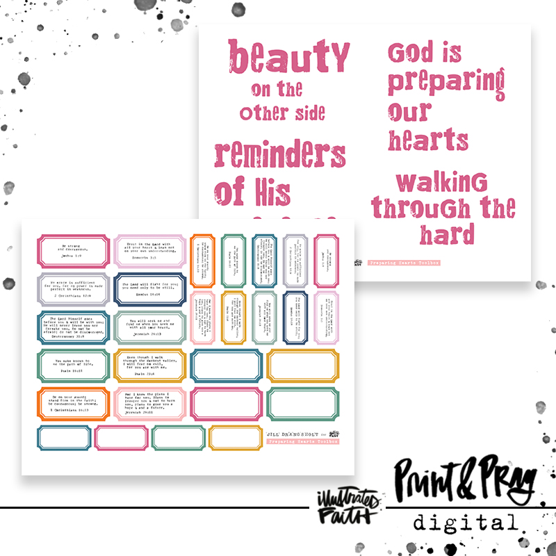 This toolbox was designed to use alongside the Preparing Hearts devotional kit. It includes scripture labels from the kit typed out for you on Jill’s vintage 1957 Royal typewriter, a few blank labels, bonus scripture labels in a mini size, and title starters directly from the devotional. If you’d like your typed scriptures on something other than a label, you can always print the labels on translucent paper (like clear sticker paper, acetate, or vellum) and then cut the scripture out of the center to adhere to anything you want to. Or cut them into strips for scripture wordfetti!
