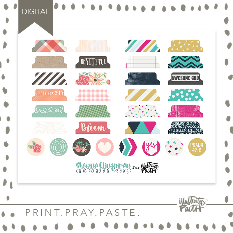 Print out these versatile Bible tidbits designed by Shawna Clingerman as a fun tool to illustrate your faith! These pieces are perfect to attach to your Bible pages to add a little something extra! Bible Bits include tabs & 1″ circles you can punch out OR cut out with scissors.