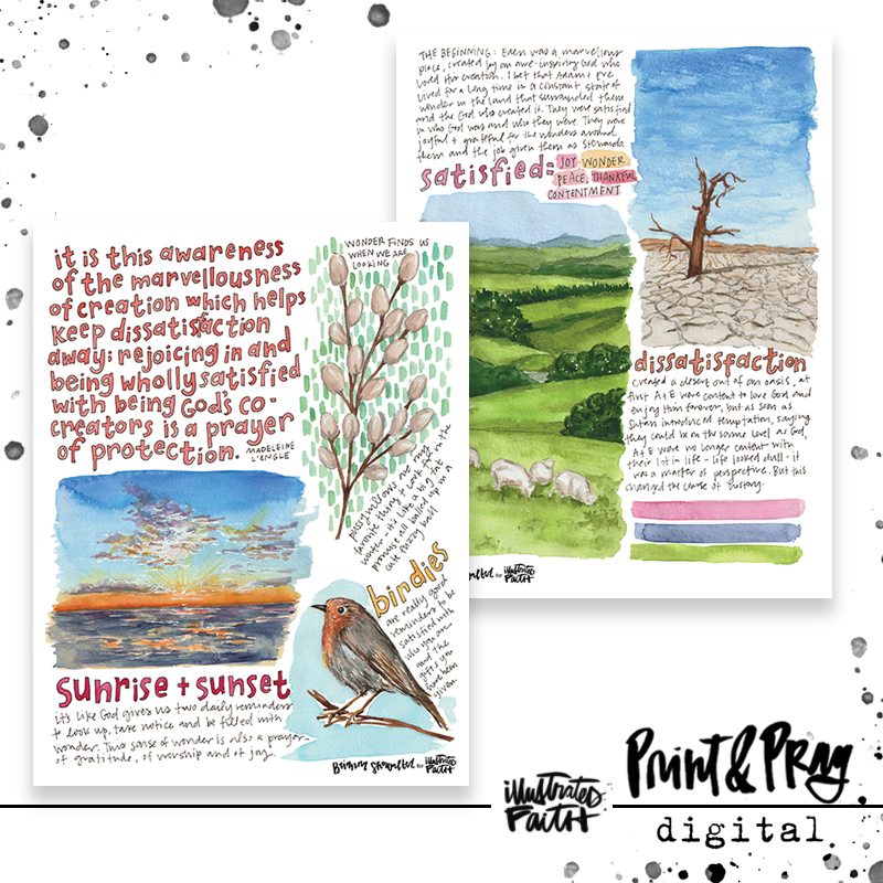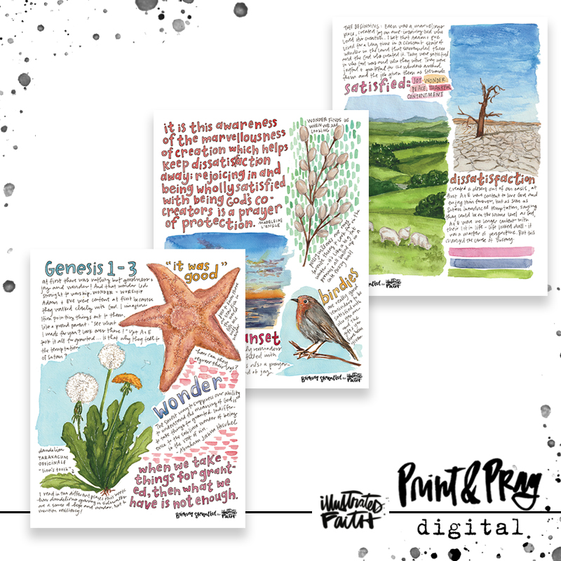 The Bible. It is known as the Word of God, Scripture, the Good Book. I fully believe that God inspired the writers of this amazing book. But you know what? It’s written by people, about people and for people. Just like you and me. And just like each of us is unique, the way we interact with the Bible is different. The stories that affect us, the characters that inspire us, the words that we ponder, the prayers we pray and the way God reveals Himself differs from person to person. Now, I am not a seminary graduate, nor do I preach from a pulpit (probably just like you!), but I do know that God meets me within these pages. And I’d like to share my musings and thoughts from these meetings with you. My brain thinks in both pictures and words, so I’m going to fill up a sketchbook and share the pages. We can grow in the Lord together! Here are some thoughts on Genesis 1-3. Shalom.