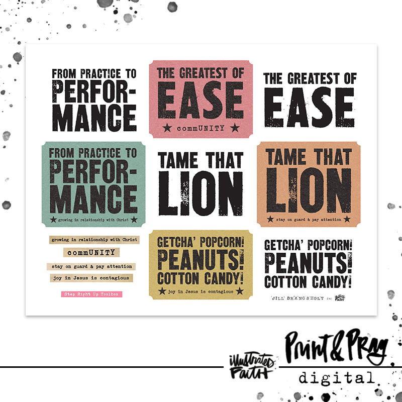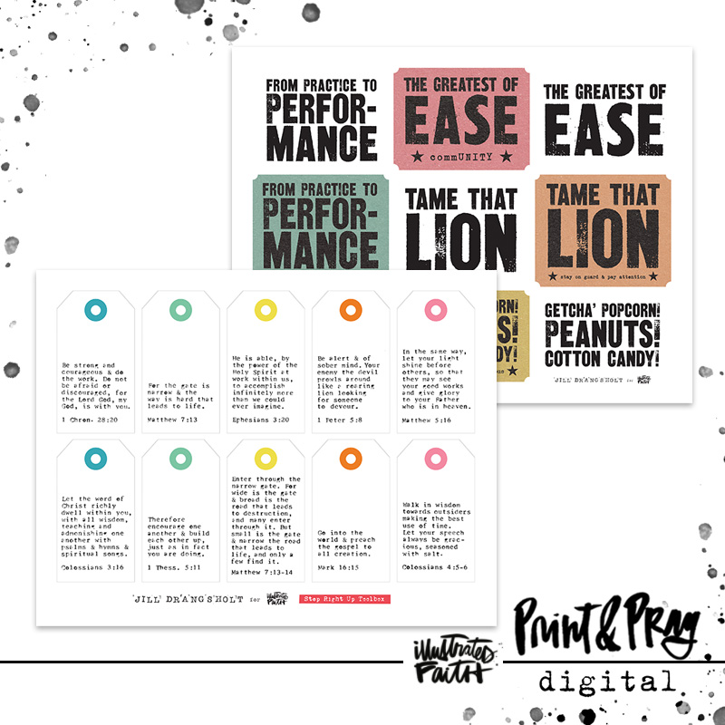This toolbox was designed to use alongside the Step Right Up devotional kit. It includes title starters and scripture tags with verses from each section typed out for you on Jill’s vintage 1957 Royal typewriter. If you’d like your typed scriptures on something other than a tag, you can always print the tags on translucent paper (like clear sticker paper, acetate, or vellum) and then cut the scripture out of the center to adhere to anything you want to. Or cut them into strips for scripture wordfetti!