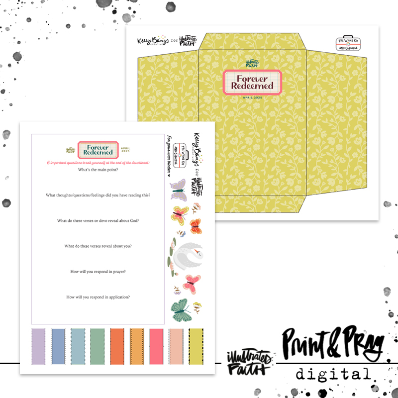 Now you have more goodies to add to your stash each month as you work your way through the monthly Illustrated Faith Devotional. This kit will give you color palettes, labels, tags, tabs, cute memos for notes and even an easy DIY envelope to corral all your ephemera bits!
