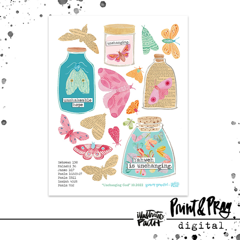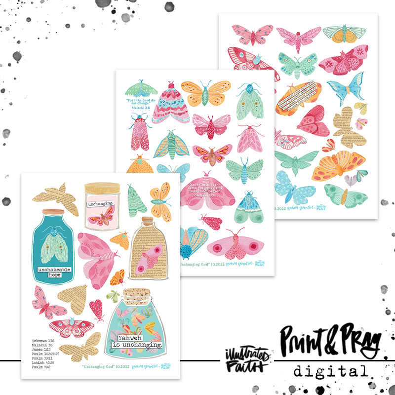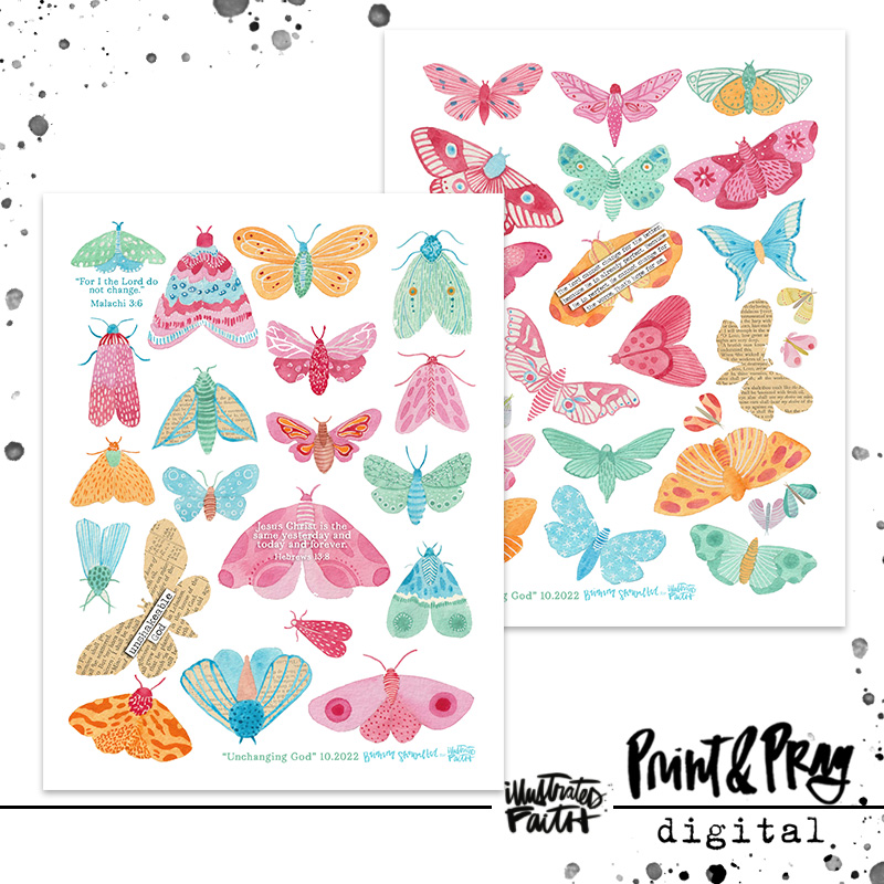 Over the past few months, there have been a lot of big changes in Brianna’s home and family. Most have been good changes, some have been hard. But no matter if it’s good like her daughter starting high school, or sad, like her Grandma going to heaven, it’s still change. And as we all know, change takes getting used to. As the season is starting to change, Brianna is noticing how the moths and bugs are finding their way into the house, and their frantic wings beating for the outdoors has her thinking about the unchanging nature of our Father. He cares about those tiny moths with tiny life spans, and He cares exponentially more about you. It is such a comfort to be constantly reminded by these little moths of how even if things change in your life, God isn’t changing at all, now or ever. He is still ever-present, full of lovingkindness, grace and mercy. Hopefully these little moths also remind you of our unchanging God. They will be so fun to use in all sorts of projects and layouts. Be sure to have a look at the coordinating papers if you’d like more beautiful little moths in your life.