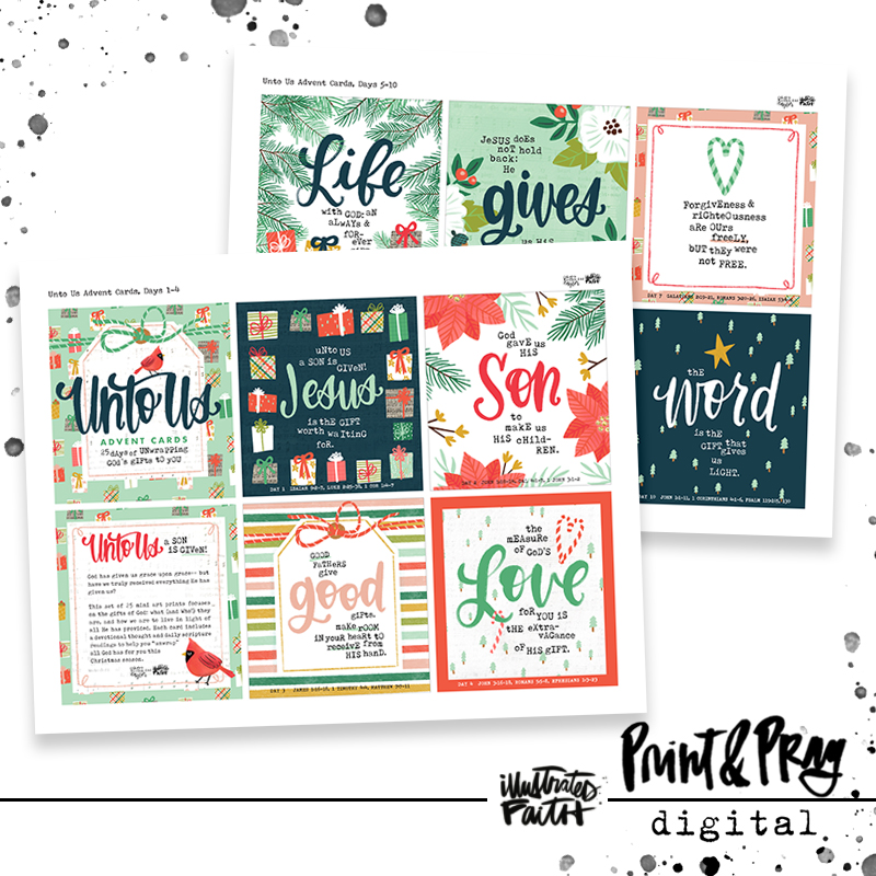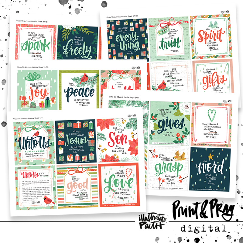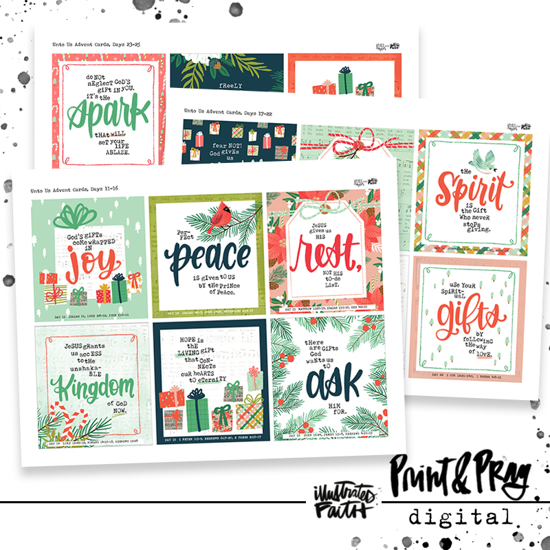 “’This set of 25 Advent Cards focuses on the gifts of God: what (and Whom!) they are, and how to fully receive all He has generously given us. Each card includes a devotional thought and daily scripture readings to help you “unwrap” all God has for you this Christmas season. Be sure to check out the coordinating elements and patterned papers!” -Taylor Rauschkolb