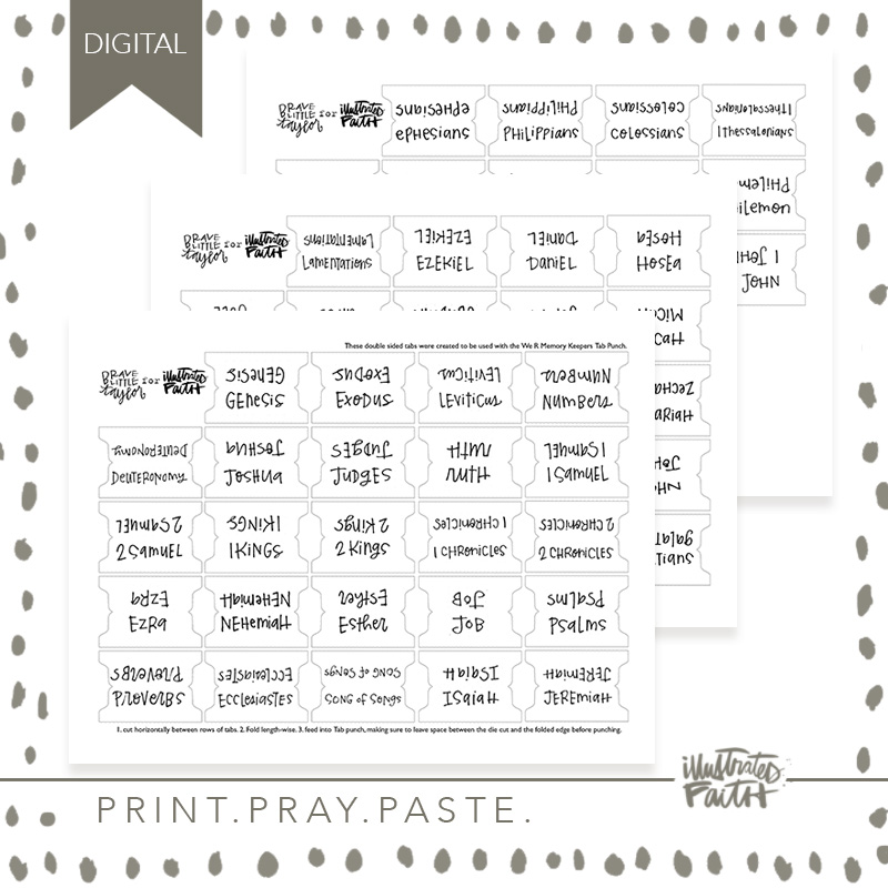 Print out these gorgeous Bible tabs designed by Taylor Rauschkolb of Brave Little Taylor as a fun tool to illustrate your faith! These pieces are perfect to attach to your Bible pages on the books of the Bible! These tabs are compatible with the We R Memory Keepers tab punch & can be punched single or double sided!