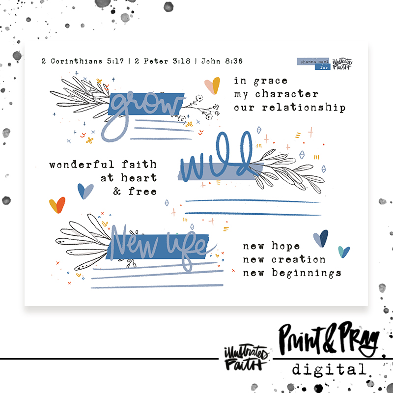 “There is something about the word WILD that just stirs my heart every time! It is something I pray for in myself, for my children, & for YOU! That we always have a heart that strives to know Jesus WILDLY, that we don’t conform to the expectations set around us, & that we are FREE in Christ! In this set, you will find title starters, journaling strips, & paintbrush highlighters to help you journal those wild prayers!” -Shanna Noel
