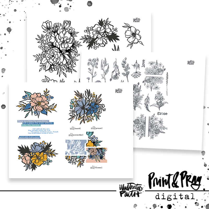 Wildflower Printables from our monthly kit! This set of ephemera has a little of everything! You’ll get typed word strips, titles, tabs, & some beautiful hand-drawn florals… both black/white and colored in! There’s everything you need to have brighten up your journey right there in your Bible margins!
