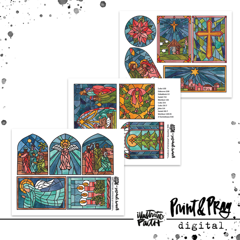 The story of Christmas is not a new one, but it never gets old. All of the details and familiar characters are comforting to us as we wait for Jesus’ return. How lovely would the story be if told in stained glass with early morning winter light streaming through the colored glass, shining through Mary and Joseph and Jesus, making them glow and seem alive in a new way. These stained glass window illustrations would be lovely printed on sticker paper or clear acetate. They would also make great gift tags or cards, and are perfect for just about any scrapbooking or journaling adventure. Merry Christmas friends!