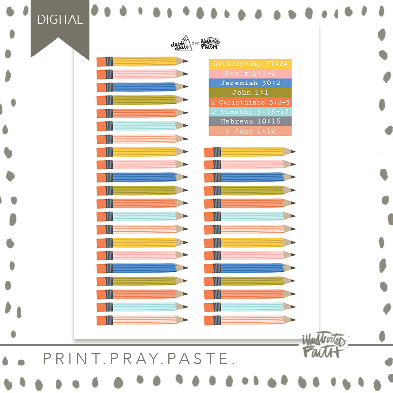 By special request, a whole sheet of cute pencils to adorn your bible pages! This set goes great with the Word Nerd devotional kit & the Bible Bookworm printable! Print out this adorable print, pray, paste designed by Elaine Davis as a fun tool to illustrate your faith!